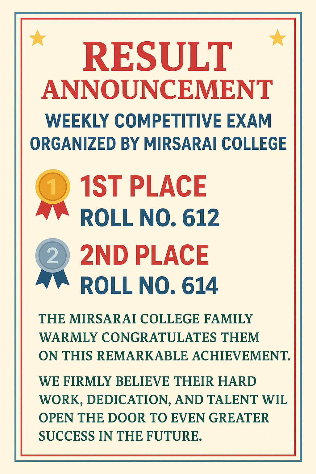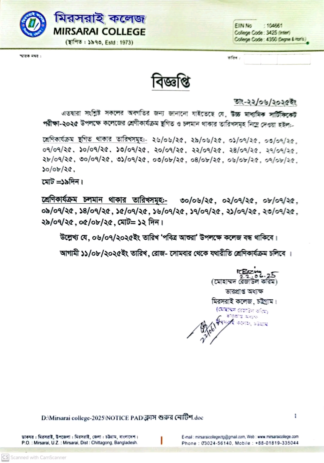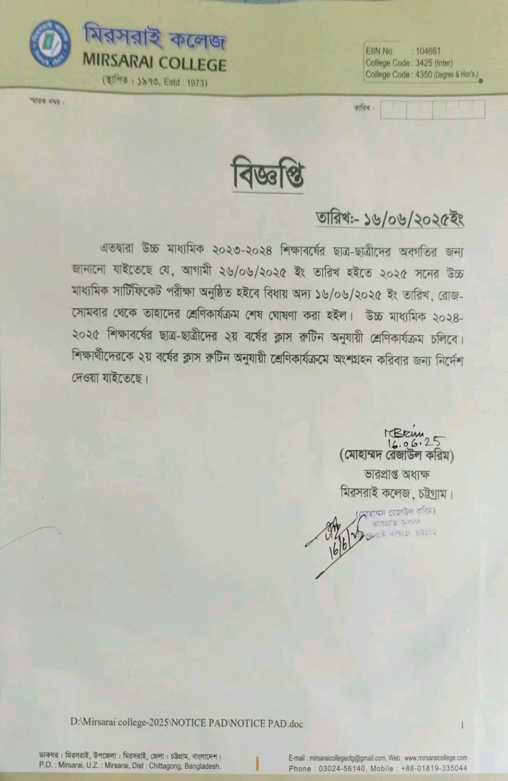 উচ্চ মাধ্যমিক ২০২৪ - ২০২৫ শিক্ষাবর্ষের শিক্ষার্থীদের দ্বিতীয় বর্ষের ক্লাস রুটিন অনুযায়ী ১৭/০৬/২০২৫ তারিখ থেকে শ্রেণী কার্যক্রম চলিবে। |