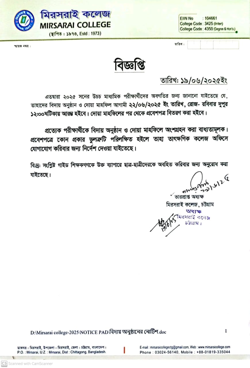 উচ্চ মাধ্যমিক ২০২৫ সালের পরীক্ষার্থীদের আগামী ২২ জুন, রোজ রবিবার প্রবেশপত্র বিতরন করা হবে এবং বিদায় ও দোয়া মাহফিল অনুষ্ঠান অনুষ্ঠিত হবে |