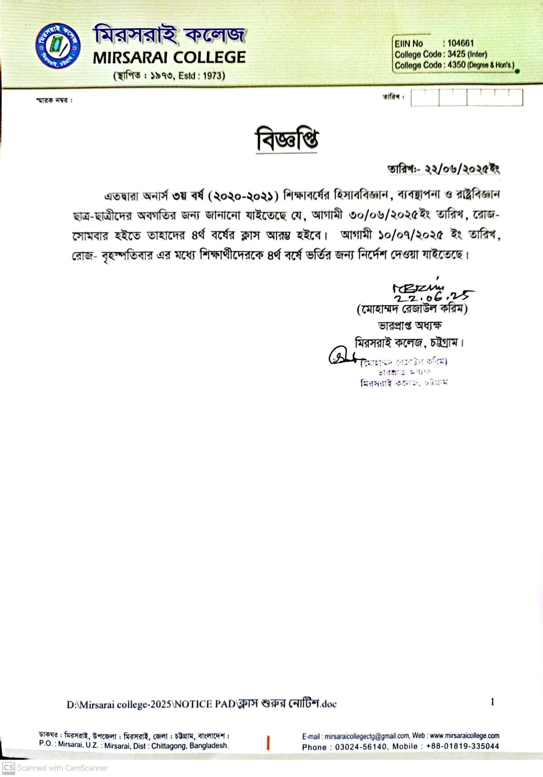 অনার্স চতুর্থ বর্ষের ভর্তি ও ক্লাসের বিজ্ঞপ্তি |