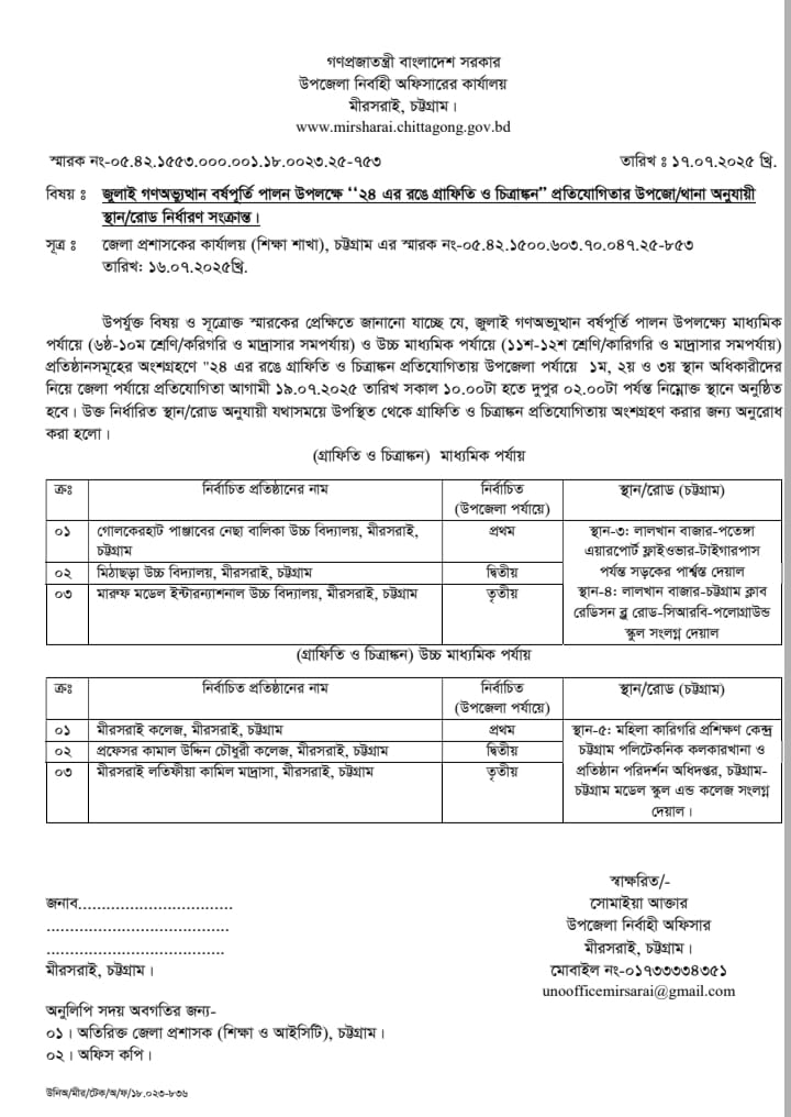জুলাই গনঅভ্যুত্থান চিত্র অংকন প্রতিযোগিতায় প্রথম স্থান অর্জন করেছে মিরসরাই কলেজ। অভিনন্দন |