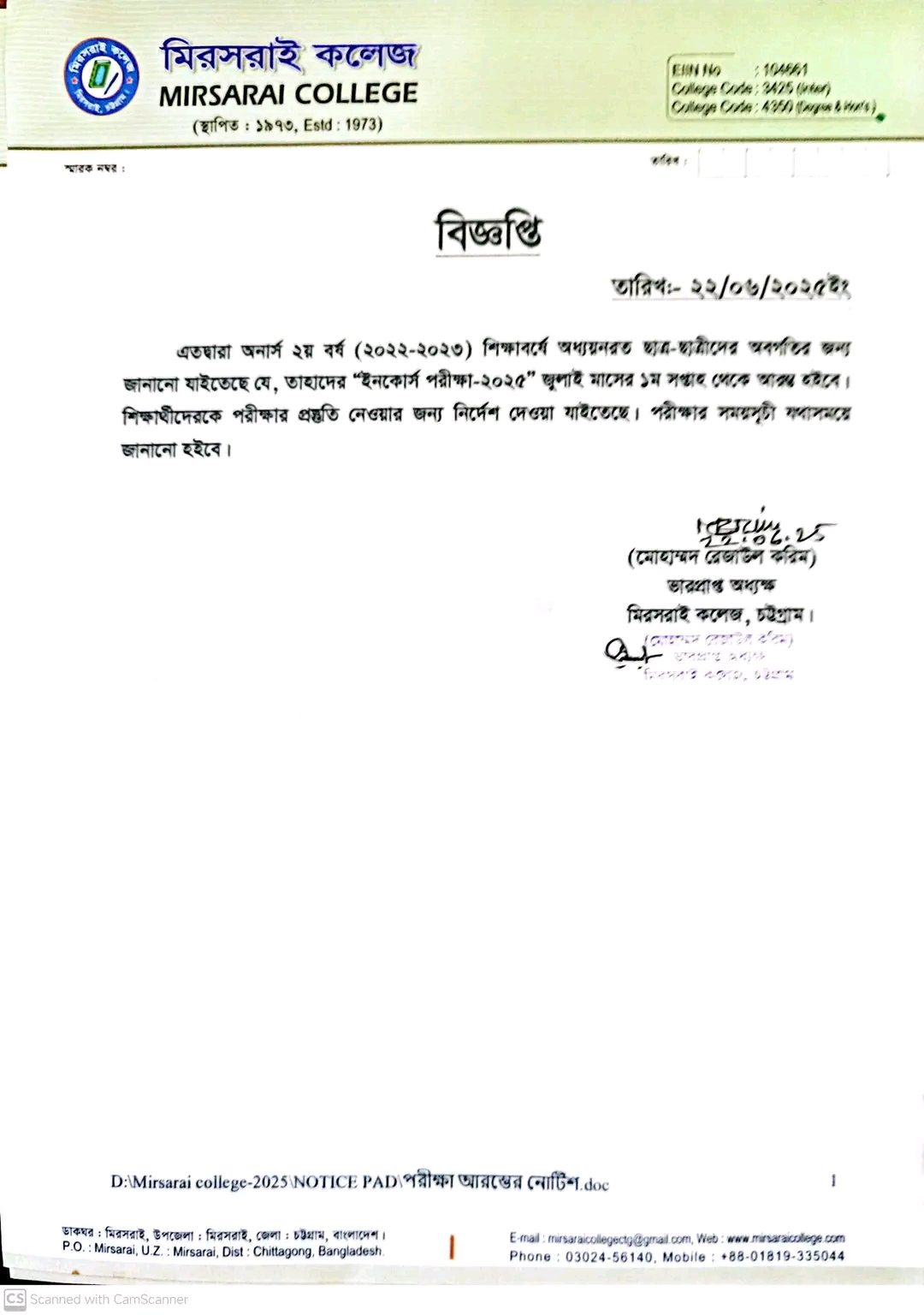 অনার্স দ্বিতীয় বর্ষের ইনকোর্স পরীক্ষার বিজ্ঞপ্তি |